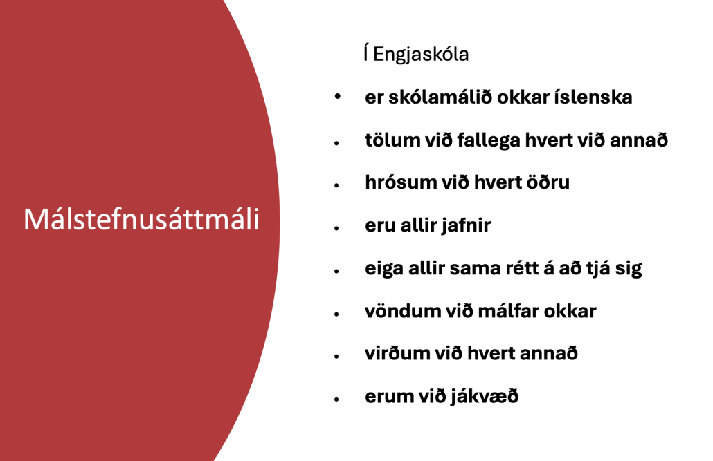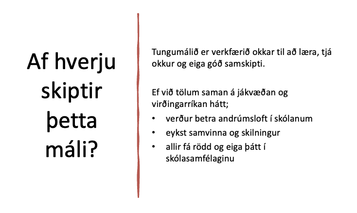 Tungumálið er órjúfanlegur þáttur af tilveru okkar og flest samskipti byggja að einhverju leiti á málnotkun. Málumhverfi barnanna okkar á að einkennast af skilningi, gagnkvæmri virðingu þar sem mannréttindi og vinsemd eru í öndvegi.