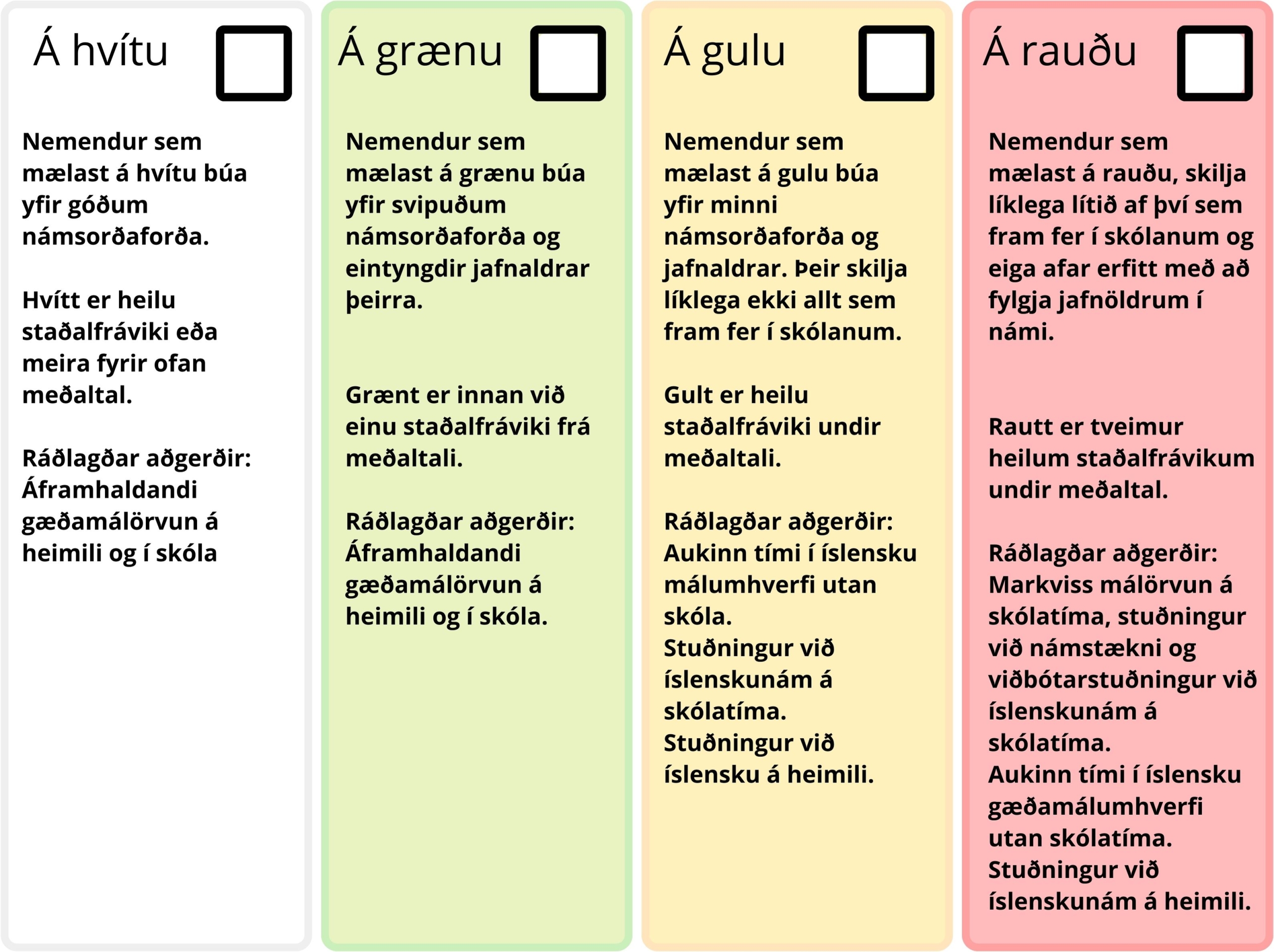 Niðurstöður prófsins gefa vísbendingar um hversu mikið barnið skilur af því sem fram fer í kennslustundum og hver stuðningsþörf barnsins er.