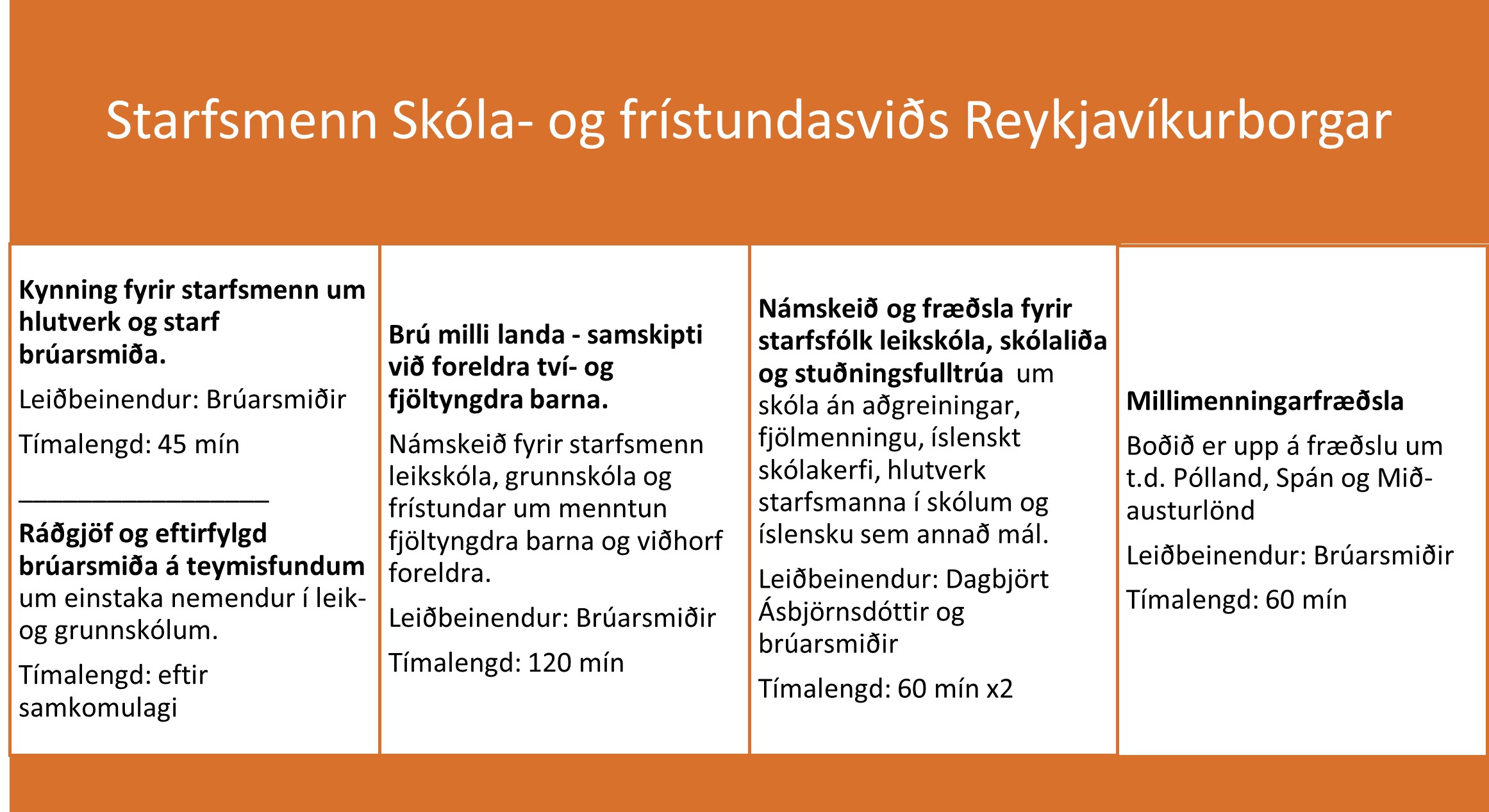 Markmið brúarsmiða er að byggja brú á milli fjöltyngdra barna og foreldra þeirra, sem og starfsmanna skóla- og frístundasviðs Reykjavíkurborgar.