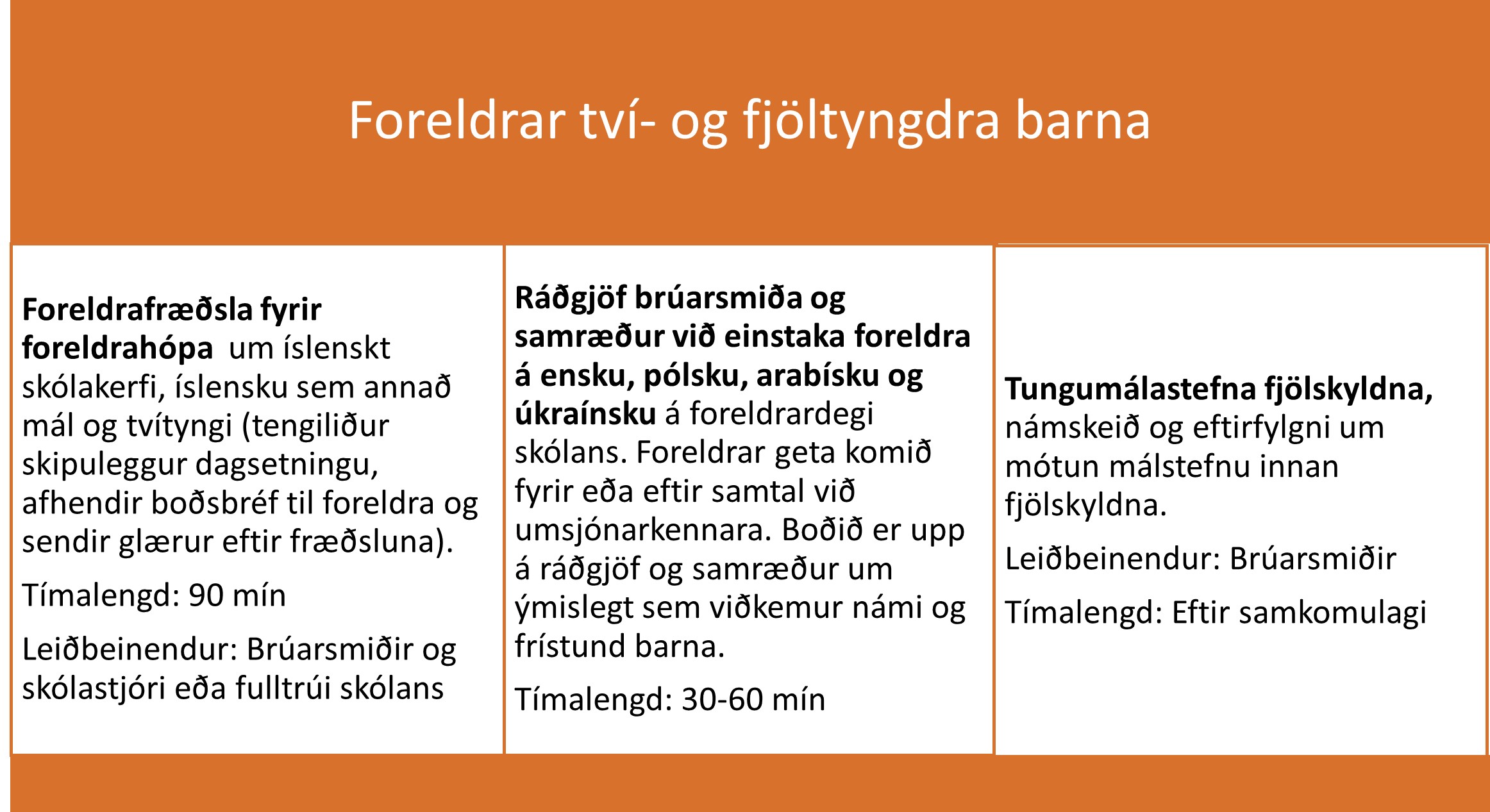 - verkefni með foreldrafélögum: Móðurmál Samtök um tvítyngi og SAMFOK