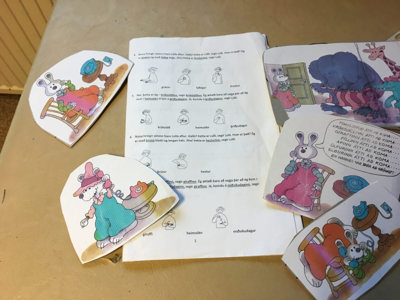 Eins og sést hérna á myndinni, þá er búið að gera loðtöflusögu eftir einni Lúlla bók. Textinn er síðan settur upp með TMT myndum, þannig að kennarinn geti gert táknin um leið og sagan er sögð. Auðvitað eru börnin hvött til að gera táknin með kennaranum og segja orðin.