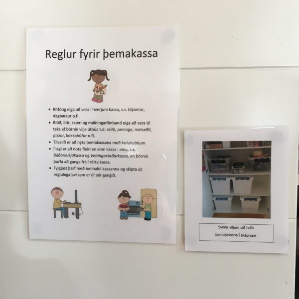 Í reglunum fyrir þemakassa er tekið fram að í hverjum kassa eigi að vera ritmálsörvandi verkfæri sem undirstrikar það að við erum alltaf að nota ritun, hvort heldur er til að skrifa, teikna, túlka eða skapa.